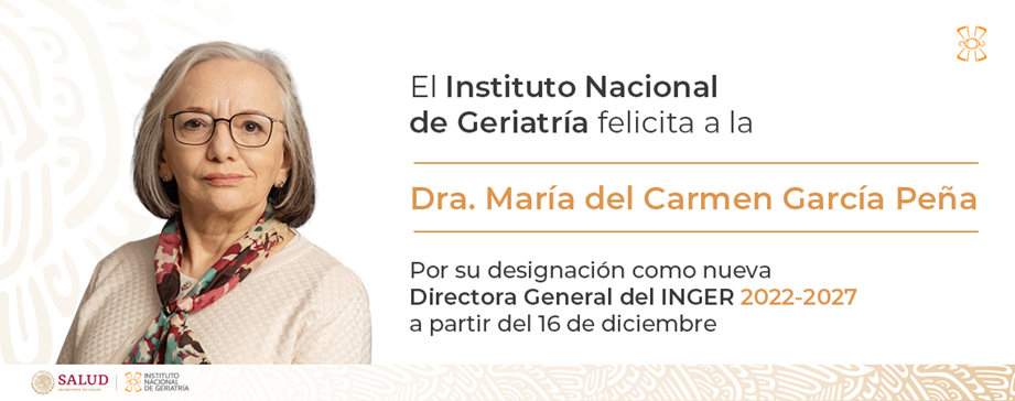 A partir de este 16 de diciembre, la Doctora María del Carmen García Peña, es la nueva Directora General del Instituto Nacional de Geriatría (INGER) en sustitución del Doctor Luis Miguel Gutiérrez Robledo, quien dirigió desde 2009 y es el fundador de este valioso Instituto. García Peña ocupaba el cargo de Directora de Investigación del mismo INGER.